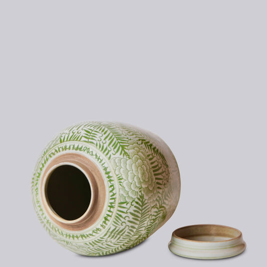 Rustic Peony Green and White Porcelain Jar