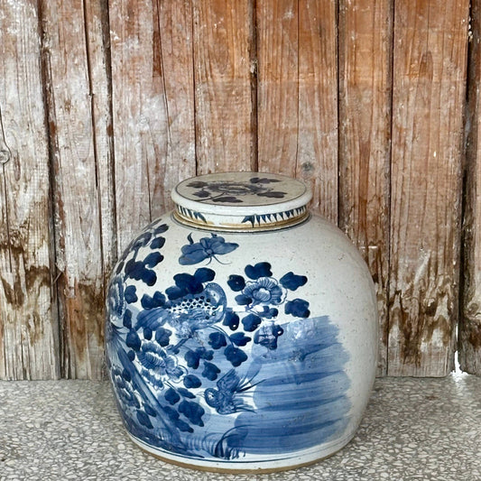 Blue & White Porcelain Bird & Flower Large Round Storage Jar