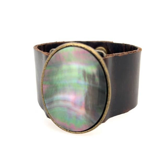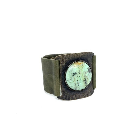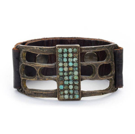 Oval Cabochon Leather Bracelet: Vintage Brown w African Turq