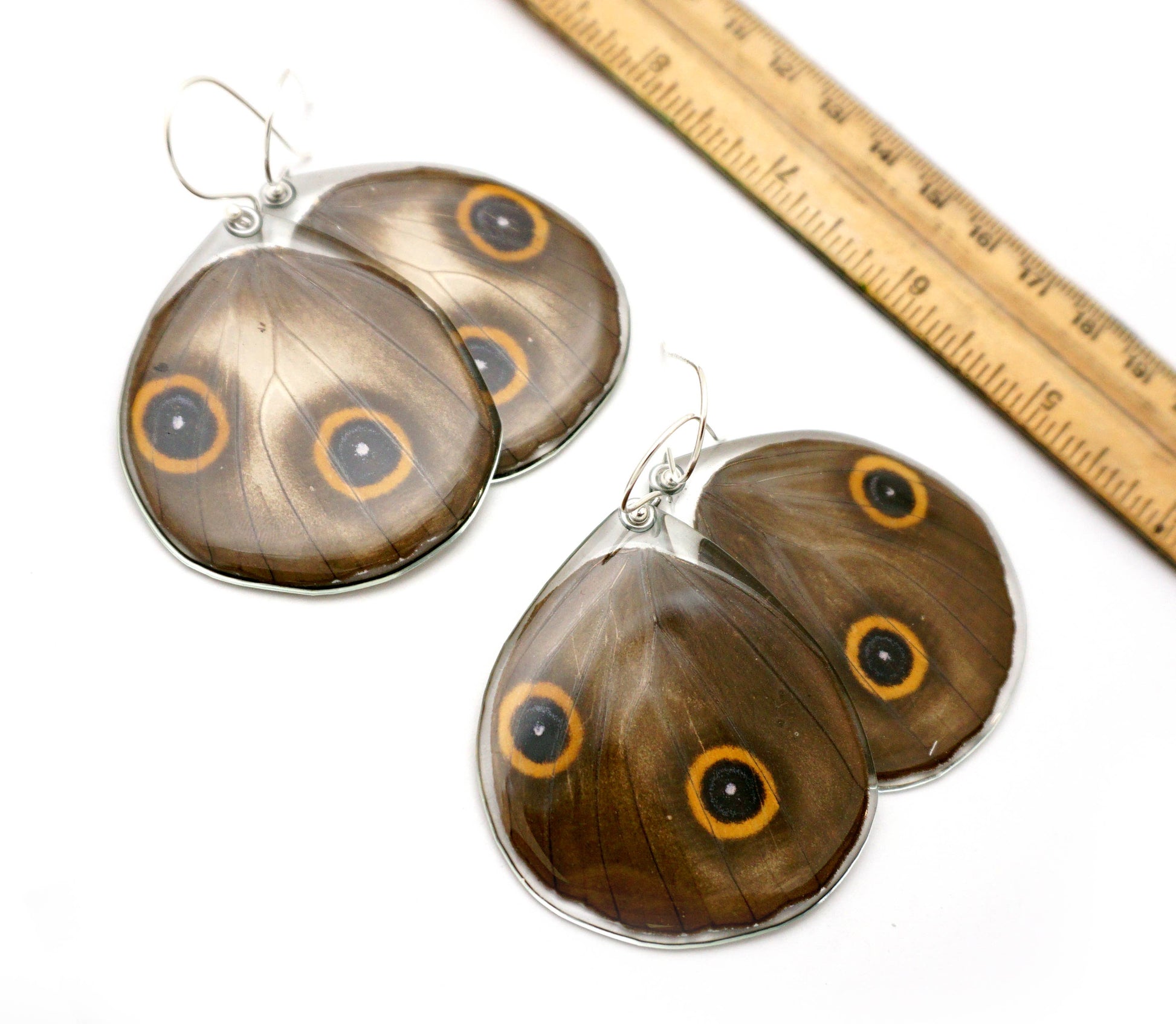 Real butterfly wings pair, whole wing, encased in resin using a proprietary process. Sterling silver earring wire, reversible!