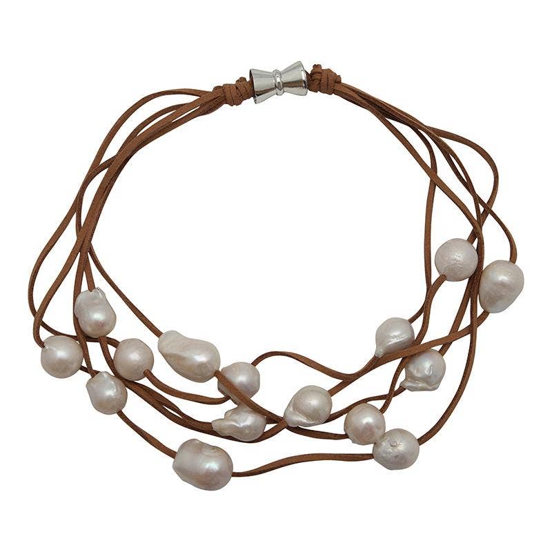 5-Strand Vegan Tan Suede w/ Moveable Large White Freshwater Cultured Baroque Wild Pearls on Rhodium Plated Stainless Magnetic Closure 19".