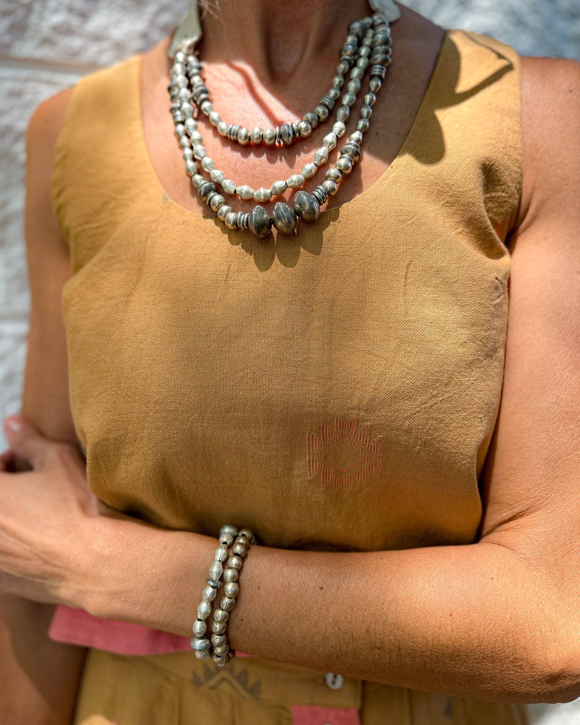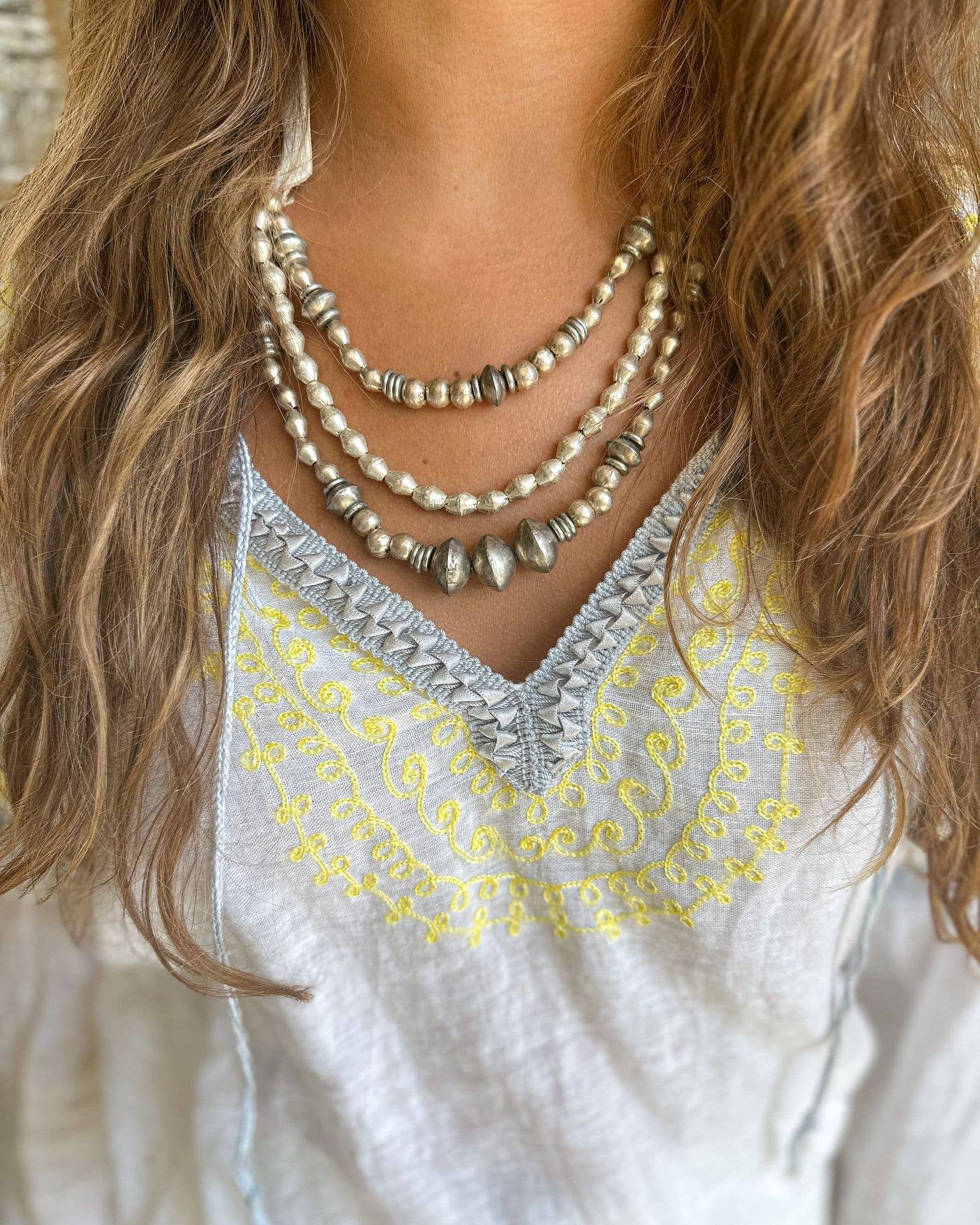 The Twine & Twig Marrakech Necklace is designed with silver metal and globally sourced beads that are strung onto individual strands and tied together onto our signature branded suede straps. The necklace features two length options with a brass snap closure.