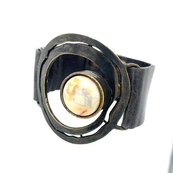 Rebel off-center stone bracelet. Antique brass finish with semi-precious stone. Genuine Italian leather. Adjustable snap closure. Handcrafted in Brooklyn. Style #5221.