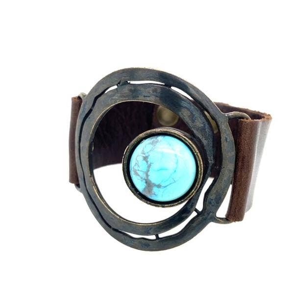 Off-Center Stone Leather bracelet: Vintage Brown w African Turq