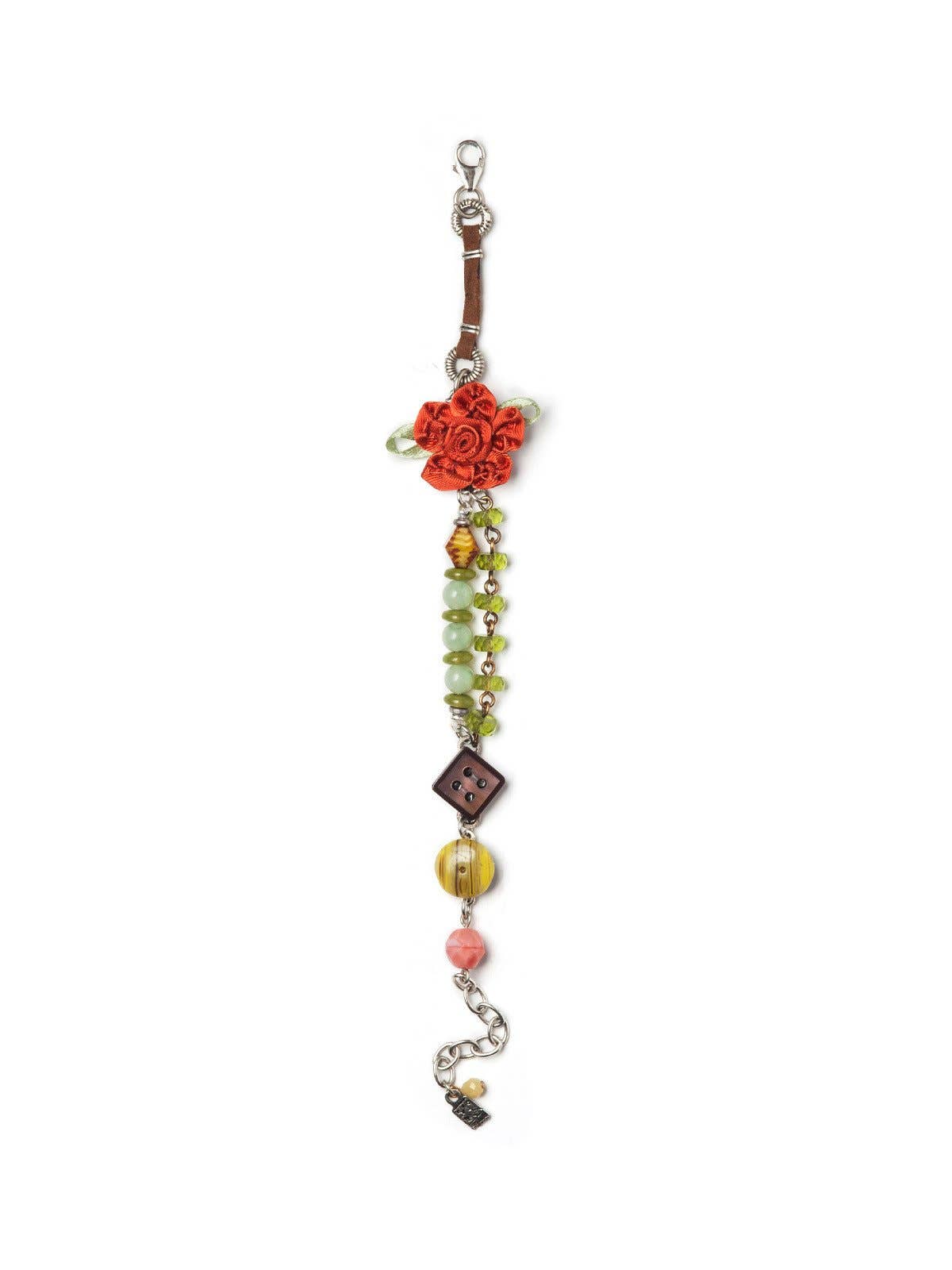 Assorted faceted glass beads, cast resin cabochon, fabric appliqué, suede ribbon, antique silver color plated findings, chain and lobster clasp.